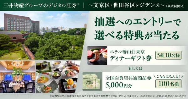 | 内容 | 「文京区・世田谷区レジデンス」へ投資した方の中から抽選で豪華特典をプレゼント 【当選内容】 ホテル椿山荘東京 ディナーギフト券:5組10名 全国百貨店共通商品券5,000円分:100名 |