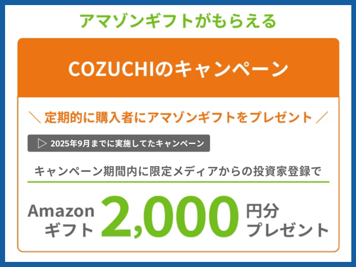 中でもCOZUCHIは、1万円から購入できる、10%を越える利回りの案件が多い、アマゾンギフトがもらえるなど、おすすめポイントが多いです。