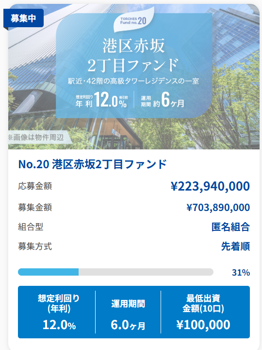 3月1日12時から募集されている「港区赤坂2丁目ファンド」は、10万円から出資ができる内容になっています。