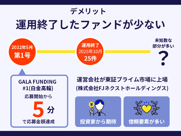 GALA FUNDINGの注意点・デメリットとしては、「運用終了したファンドが少ない」ことがあげられます。