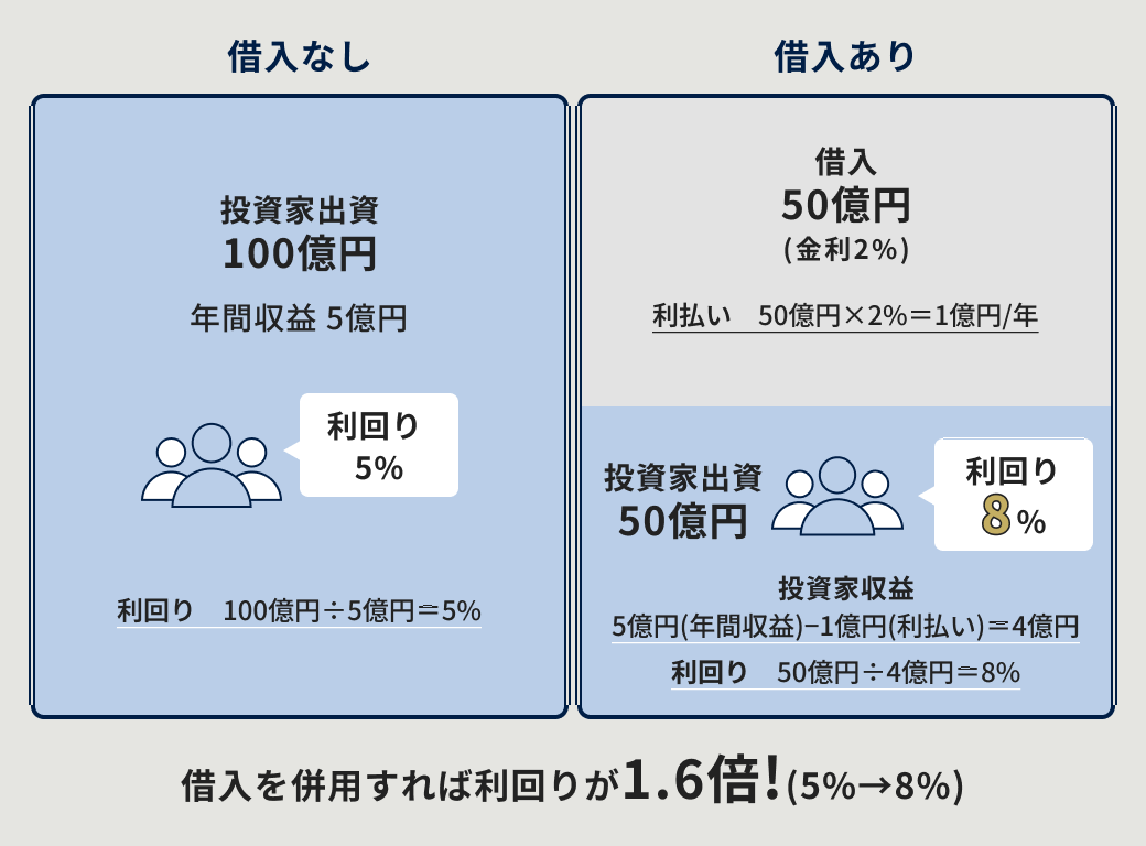 レバレッジをかけることで、同じ出資金額でも効率的に運用しやすくなり、出資者に対する想定利回りを高めることが可能となっています。