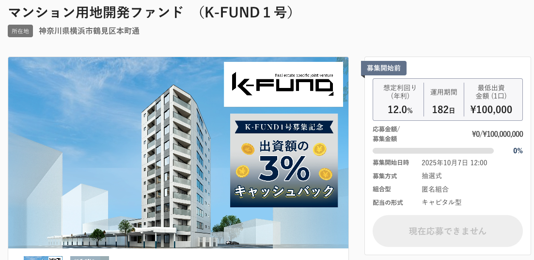 また、K-FUNDでは第1号ファンド募集記念として、出資額の3%をキャッシュバックするキャンペーンが実施されます!