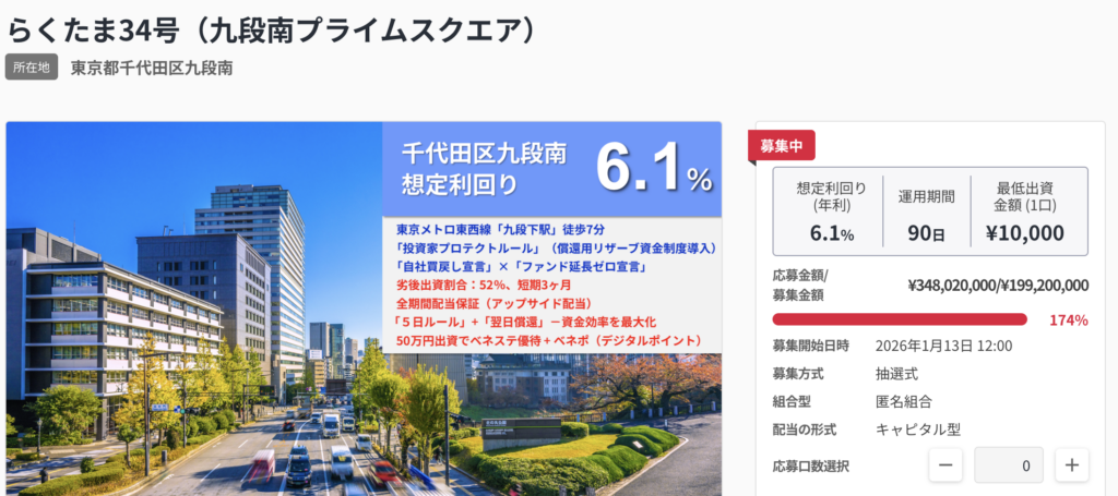 また、らくたまでは抽選式のファンドが1月13日12時から募集されています。