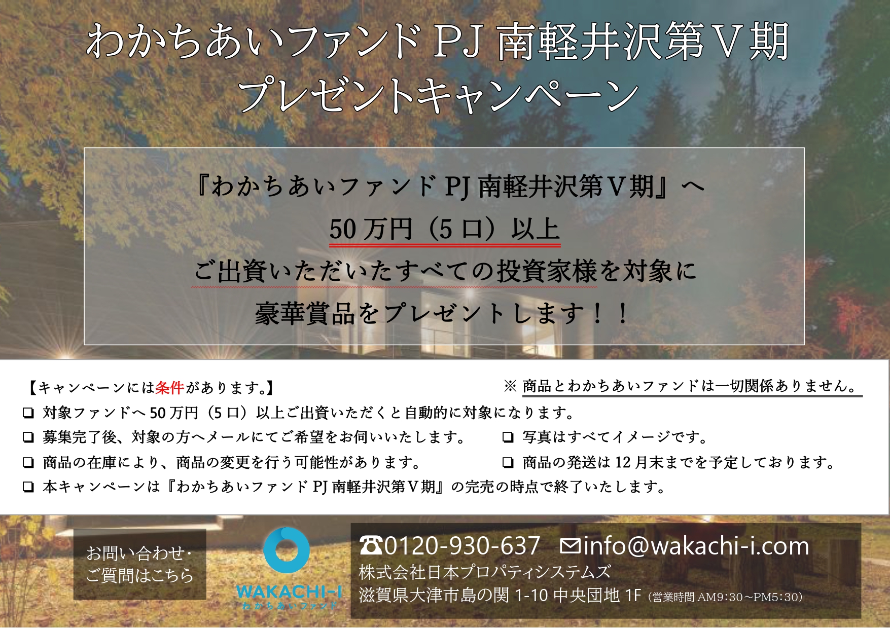 | 適用条件 | 「わかちあいファンドPJ南軽井沢第Ⅴ期」へ50万円以上出資する | ||||||||